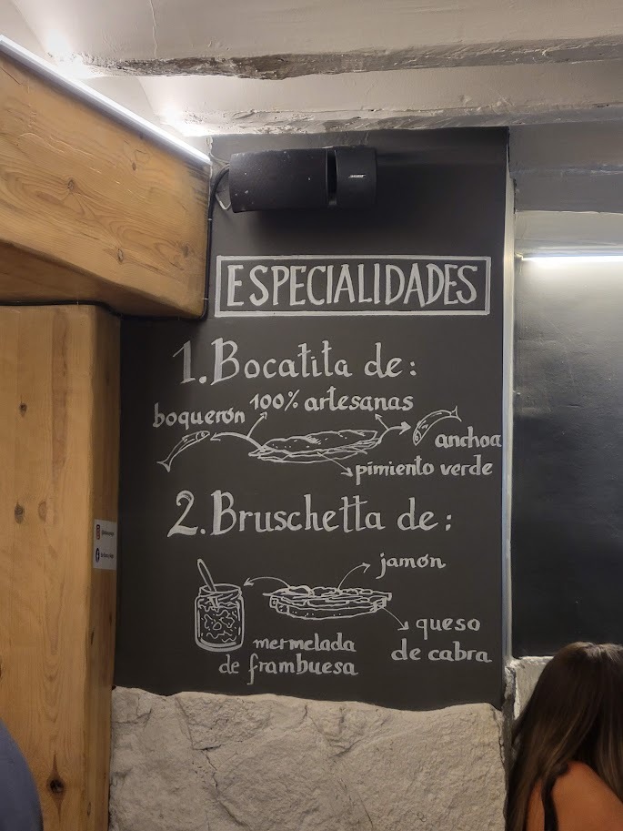 We started at Blanco y Negro, where we both had a bruschetta-style bite topped with strawberry jam, cream cheese, and ham. It was sweet, creamy, and salty all at once. I paired mine with a glass of txakoli, a lightly sparkling white wine from the Basque Country that’s crisp, dry, and perfect with tapas.